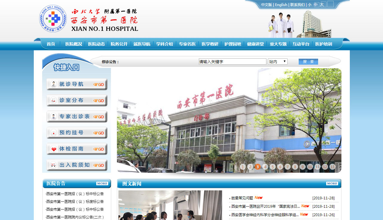 西安市*醫院(西北大學附屬*醫院)建于1941年,是西安市衛生健康委直屬的三級甲等綜合性醫院,占地面積15386.16㎡,建筑面積38308.11㎡。醫院編制床位700張,附設西安市眼科醫院、西安市心血管病醫院及52個臨床醫療和醫技科室,設有陜西省眼科研究所、陜西省眼科疾病臨床醫學研究中心、西安市心血管病研究室、西安市皮膚病研究室、西安市臨床超聲醫學研究室、西安地區超聲診斷*會診中心以及西安市眼庫。